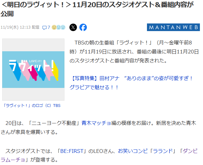 2025年11月20日、ラヴィットに「BE:FIRST」のLEO(レオ)さんが出演すると発表がありました。