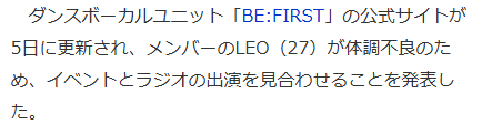 BE:FIRST(ビーファースト)のLEO(レオ)さんが、体調不良で出演見送りとなっていました。