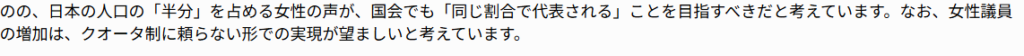 • クォータ制の導入 政治の世界などでの女性比率を上げる。ただ、女性議員の増加は、クオータ制に頼らない形での実現が望ましいという考え。