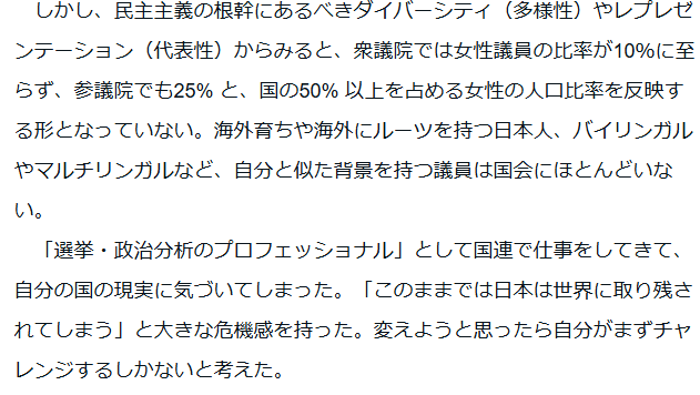 • 女性・障害者・LGBTQなど、様々なバックグラウンドの人が政権与党の中に増えることで、政策が初めて「日本人全員の声」を反映したものになると考えている。
