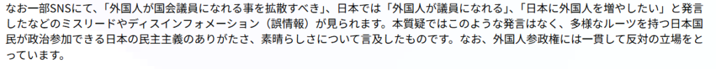 • 外国人参政権 ネット上では「容認派」と噂されることがありますが、本人は公式に「反対」を明言しています。
