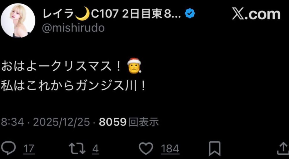 2025年12月25日、レイラさんは「これからガンジス川」とXに投稿されていました。