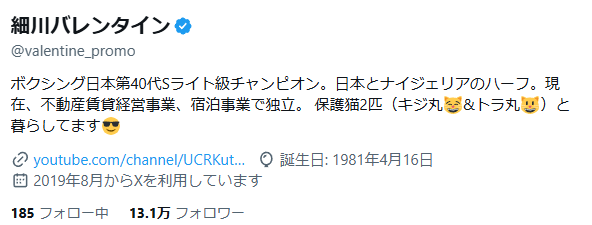 細川バレンタインさんの公式Xには、「保護猫2匹と暮らしてます」と紹介がありました。